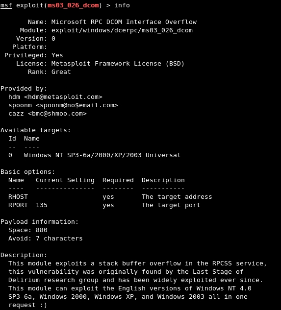 Display all the options available in specific exploit (for example ms03_026_dcom exploit)